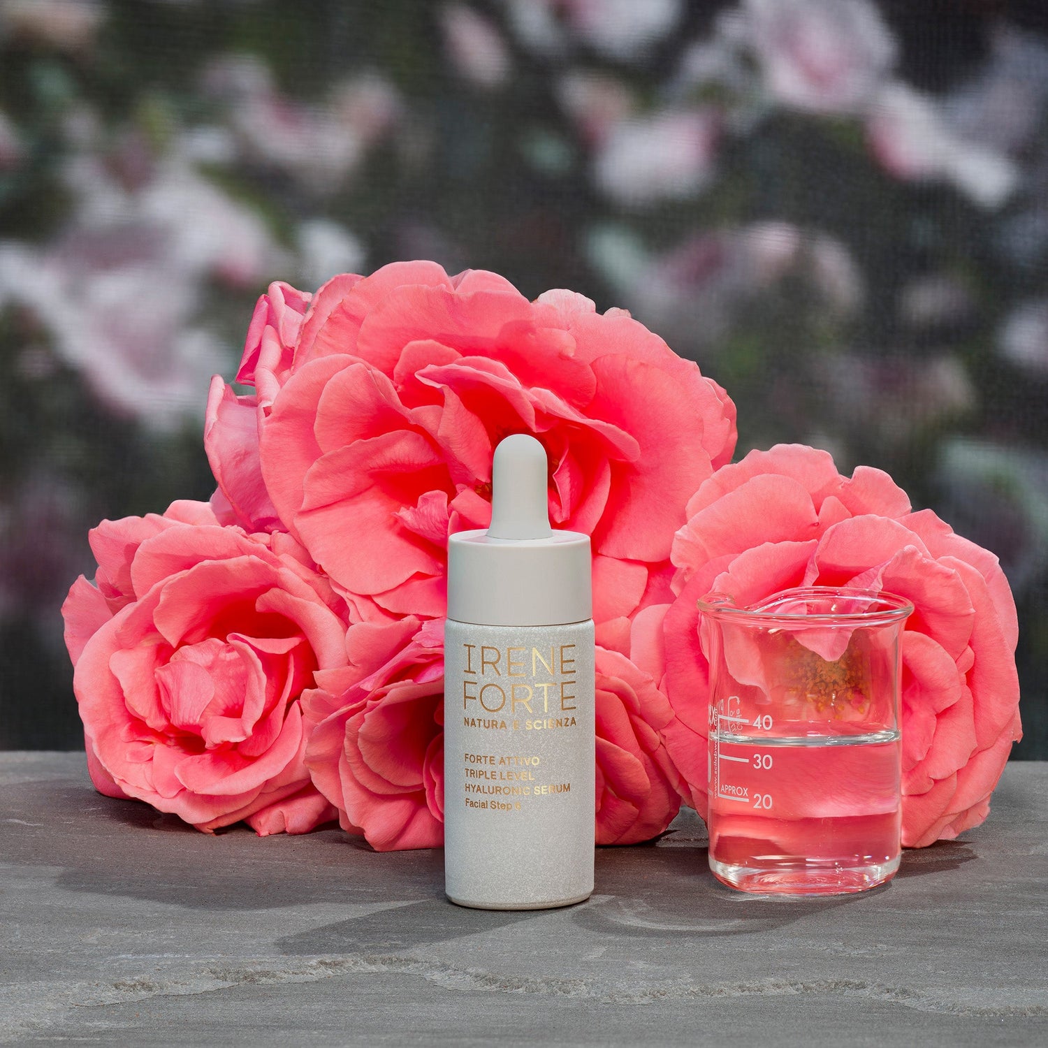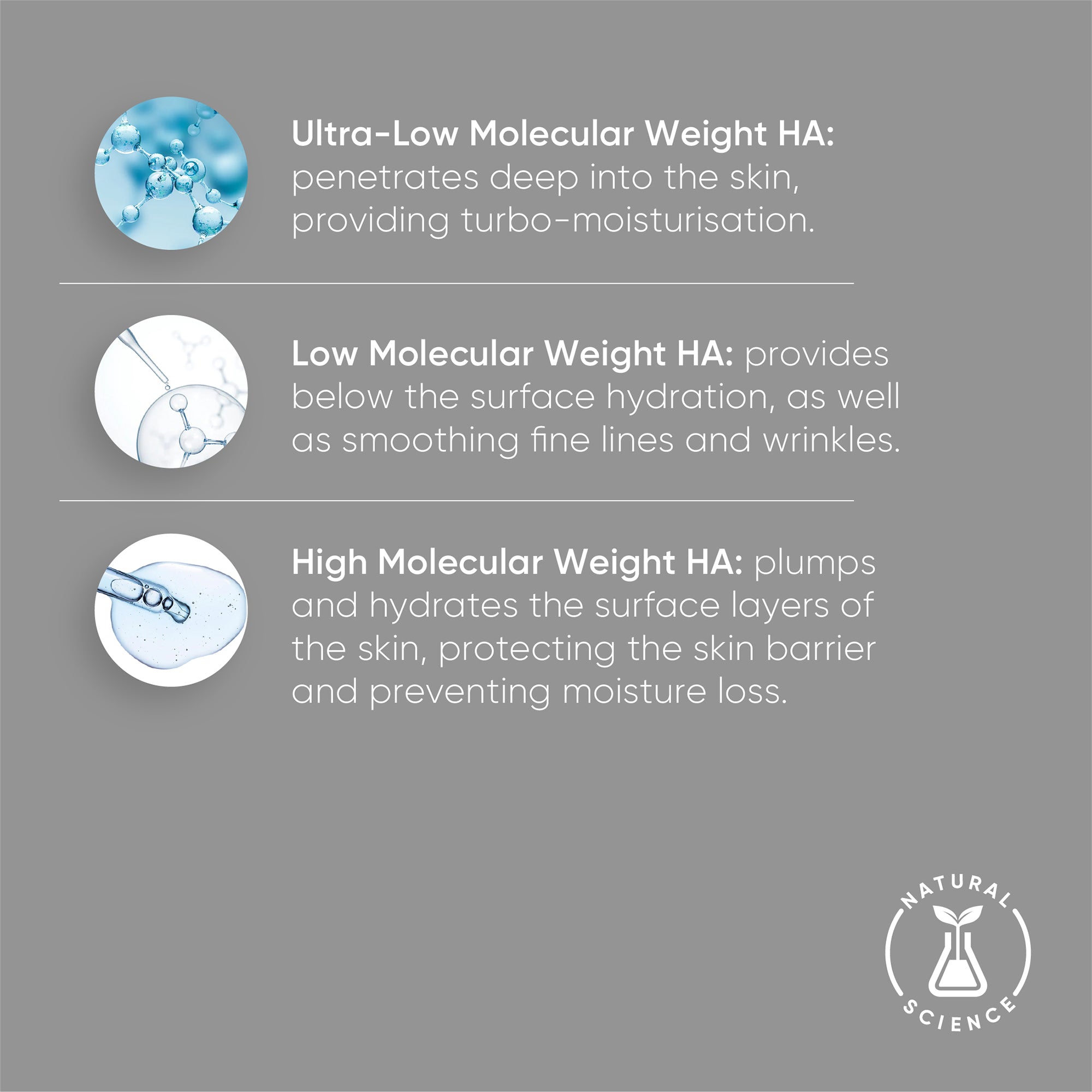 Ultra-Low Molecular Weight Hyaluronic Acid, Low Molecular Weight Hyaluronic Acid, High Molecular Weight Hyaluronic Acid, Rose Extract.