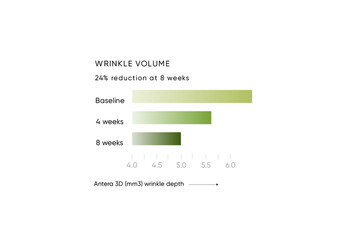 After just 4 weeks, 100% of participants showed improvements in wrinkle volume, wrinkle depth, moisturisation and elasticity. Improvements were also observed in the appearance of eye bags and brightness, with results across all clinical parameters continuing to improve with ongoing use, demonstrating efficacy over time. It also provides 48-hour hydration.