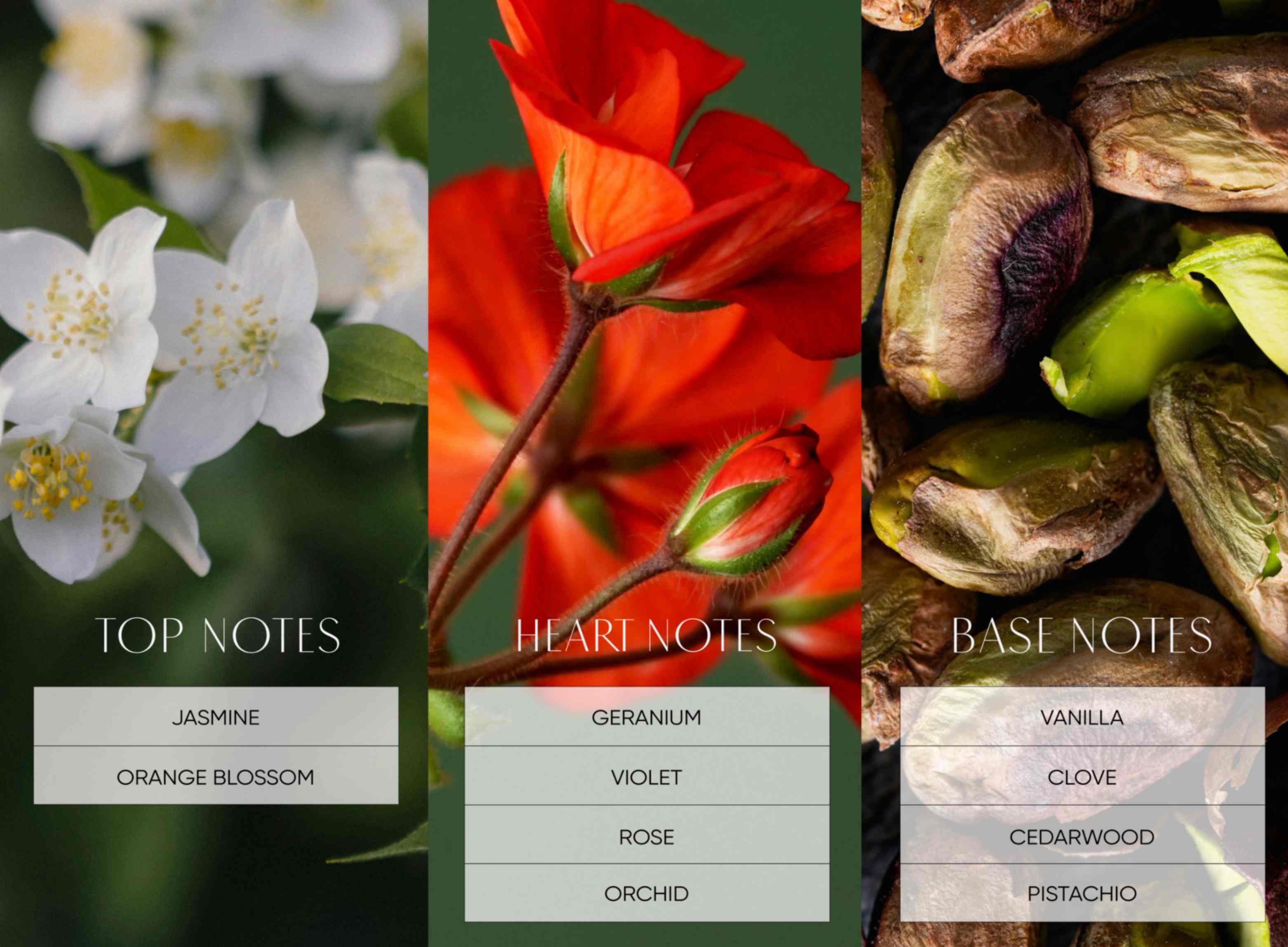 A radiant floral bouquet begins with bright jasmine and sweet orange blossom, unfolding into a lush heart of geranium, violet, rose, and orchid. The scent rests on a warm, comforting base of creamy vanilla, clove, earthy cedarwood, and nutty pistachio.